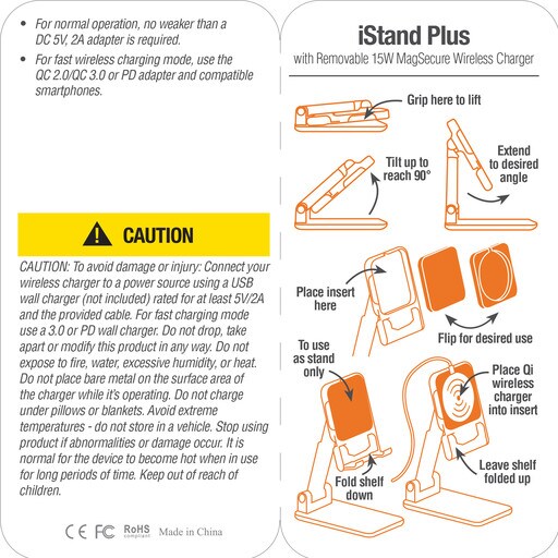 Fully collapsible, the iStand Plus with Removable 15W MagSecure Wireless Charger doubles as a cell phone holder. The detachable 15W MagSecure wireless charger magnetically connects to MagSafe-enabled devices for optimal alignment and faster charging on available devices.