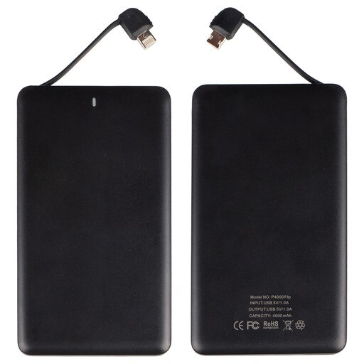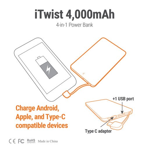 SKU: 36206 Part SKU: iTwist 4,000mAh 4-in-1 Power Bank SHIPS NEXT DAY PROGRAMS Body Color: Pricing 25 +125 +250 +350 +450 +Net$22.92$21.38$18.33$17.82$16.03 Decoration Method1 ColorFull ColorFirst LocationAdditional Locations1 ColorSetupRun ChargeSetupRun ChargeNetIncludedIncludedFree!Free! Spec SheetArt Template Product DetailsProduct SpecsShipping DetailsProduct Safety4,000mAh4-in-1: Universal built-in Lightning, Micro USB, USB-C charging cables, additional USB port The iTwist 4,000mAh 4-in-1 Power Bank provides mobile power for all. Featuring a 4,000mAh battery with dual Lightning and Micro USB connectors (1 on each side), it provides 1 full charge for most smartphones. Simply twist the wrap-around universal charging cable to switch from Lightning to Micro USB connector. This little gem also contains a USB Type-C adaptor tucked inside and a standard USB port for almost any cable you’ve got. Simply recharge the power bank with the included standard Micro USB input cord. Choose the adaptable iTwist 4,000mAh 4-in-1 Power Bank and gain a generous imprint area to promote your brand in full color, high-tech style. Due to shipping regulations on lithium-ion batteries, we are not able to expedite shipping on power banks. If expedited shipping is required, please inquire with your sales rep regarding Hazmat shipping. Min Order Qty: 25 Production Time: Ships in 1 Day Decoration Options: Up to a 3-color Imprint, Full Color Process Imprint Area: 2.2" x 3.8" (Front)2.2" x 3" (Back) Product Dimensions: 4.50" x 2.60" x 0.35" Weight: 121.63 g Material: Plastic Included Standard: Instructions, FSC-Certified Kraft Tuck Box, Charging Cable Battery Capacity: 4,000mAh Battery Type: Lithium Polymer Recharge Time: 4 Hours Output/Input: 5V/1A Master Carton Case Pack: 91 Master Carton Dimensions: 18" x 12" x 5" Master Carton Weight: 24.4 lbs California Proposition 65: California Proposition 65 SMETA AUDIT REPORT: SMETA: Sedex Members Ethical Trade Audit Report Login Login to check inventory, order sample, get a quote and more. Connect with a Distributor