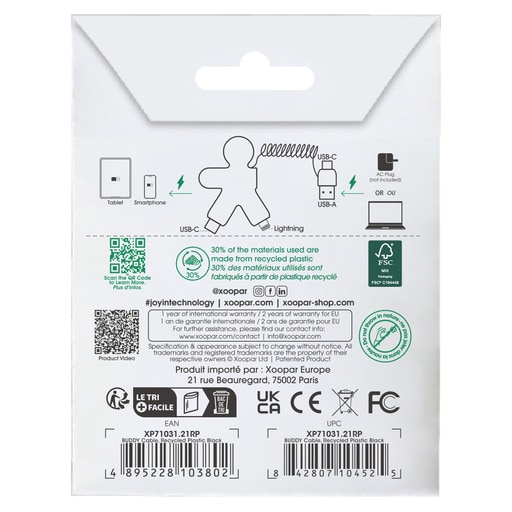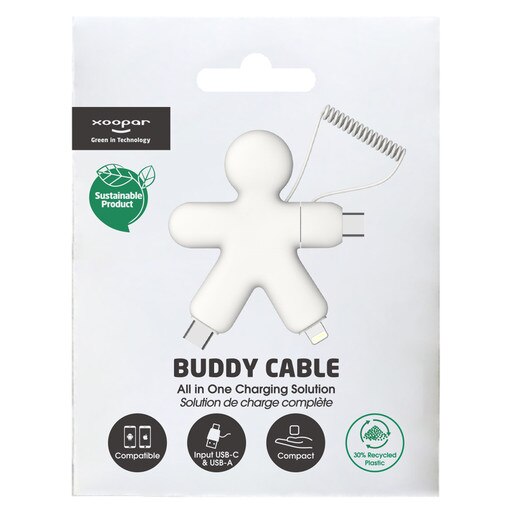 SKU: 70723 Part SKU: 70723-WHT Xoopar Buddy Cable SHIPS NEXT DAY PROGRAMS ECO-FRIENDLY Body Color: White Pricing 25 +200 +400 +600 +800 +Net$14.05$13.12$11.23$10.93$9.83 Decoration Method1 ColorMulti ColorFull ColorFirst LocationAdditional Locations1 ColorSetupRun ChargeSetupRun ChargeNetIncludedIncludedFree!Free! Spec SheetArt Template Product DetailsProduct SpecsShipping DetailsProduct Safety USB-C and USB dual inputUSB-C and Lightning-compatible outputMade from recycled plasticBuilt-in cable With its original and fun design, the Xoopar Buddy Cable will become your new best friend. With a removable arm that features dual USB-C and USB ports, and legs that feature USB-C and Lightning- compatible ports. This multi-connector cable is our pintsized pal that works with all of your devices and fits right in your pocket. Min Order Qty: 25 Production Time: Ships in 1 Day Decoration Options: Up to a 3-color Imprint, Full Color Process Imprint Area: 0.79" x 0.9" Product Dimensions: 3" x 2.6" x 0.35" Weight: 28.23 g Material: Recycled Plastic Included Standard: Instructions, Retail Packaging Master Carton Case Pack: 250 Master Carton Dimensions: 18" x 12" x 10" Master Carton Weight: 15.55 lbs SMETA AUDIT REPORT: SMETA: Sedex Members Ethical Trade Audit Report Login Login to check inventory, order sample, get a quote and more. Connect with a Distributor